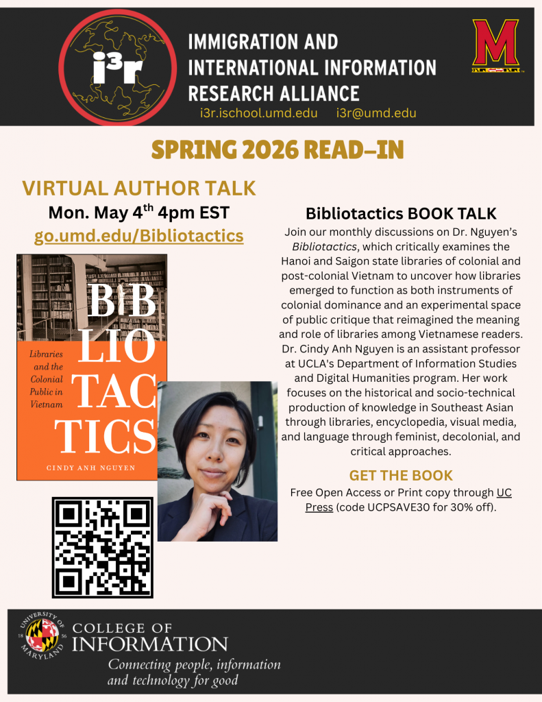 May 4: University of Maryland, Immigration and International Information Research Alliance, Bibliotactics selected for Read in – Virtual Author Talk, Zoom registration here