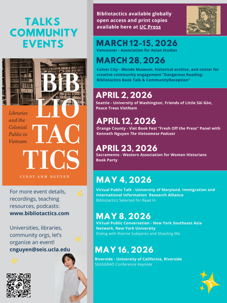 My forthcoming book Bibliotactics: Libraries and the Colonial Public in Vietnam is now available for preorder from UC Press with the promo code UCPSAVE30. Be the first to pick up your print copy to be published and shipped by January 13, 2026. Open access editions through Luminos will also be available that date worldwide. Online ordering of print copies through UC Press is available for US and Canada. Other locations can order by selecting Amazon, Barnes & Noble, or Bookshop. https://www.ucpress.edu/books/bibliotactics/paper