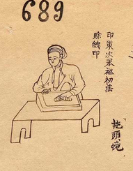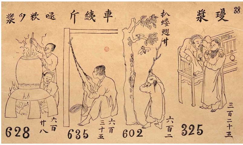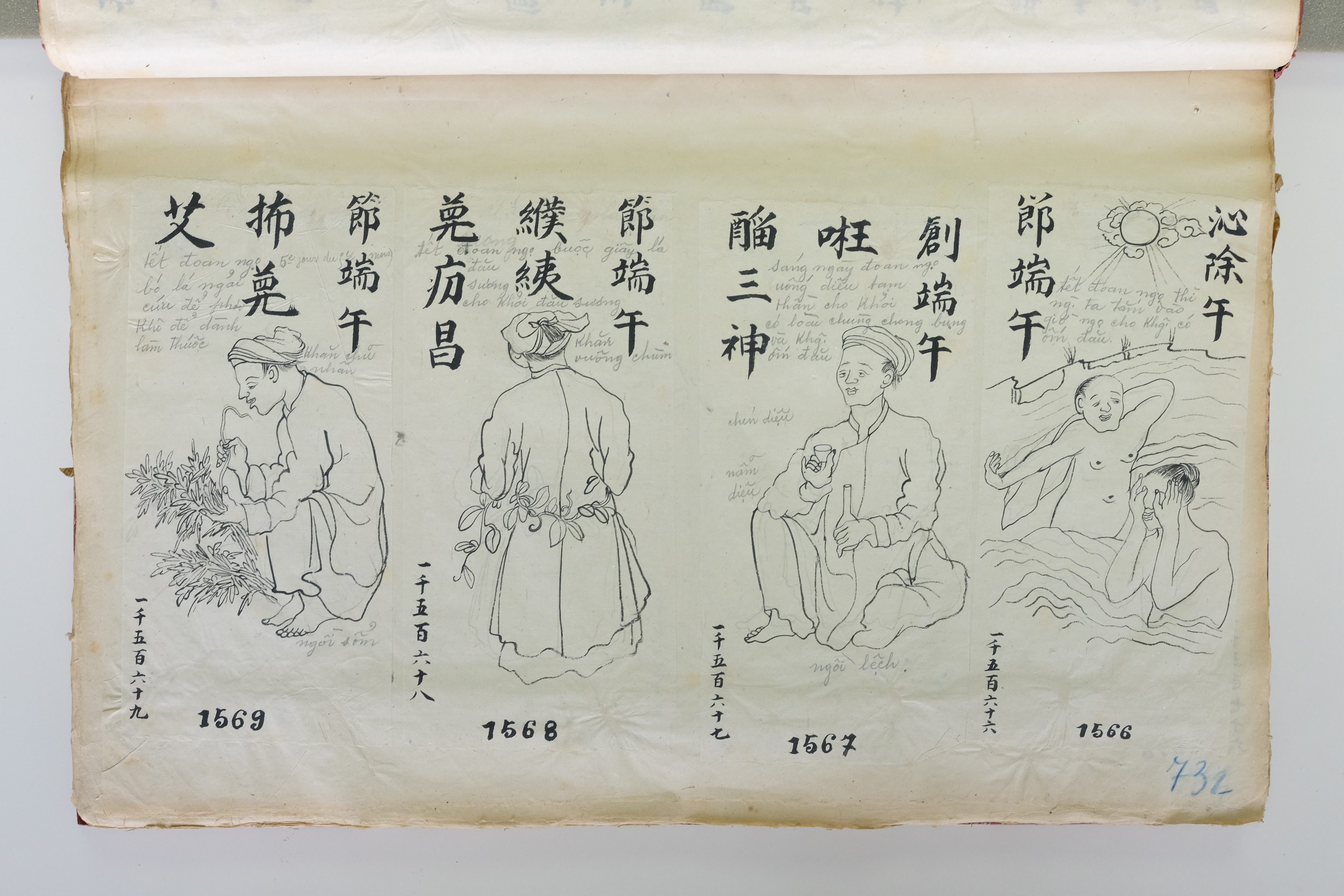 The 4,200 drawings were originally woodblock printed using wooden ‘planches’ (plates) on paper made from the bark of the Daphne plant or mulberry tree.[4] The result was 700 numbered pages of drawings, with dimensions of 65 cm x 42 cm and each page printed only on one side.[5] Ranging from drawings of tools to activities, the illustrations appear to not be organized thematically except with the intention of filling the space of each page. On later pages, the illustrations are larger and more evenly spread out, usually with three to four illustrations per page. The drawings usually are placed along one to three rows on each page. Many of the illustrations have a caption written in Nôm characters on the top of it, and at times Chinese is used as well.[6] Some of the drawings are numbered in Chinese and with a romanized number below the drawing itself.