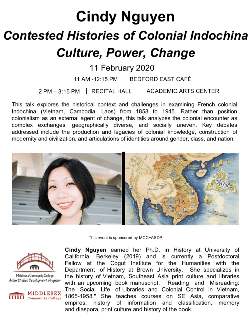 I recently delivered a talk  to 150 college students at Middlesex college through the Asian Studies Development Program. I was encouraged to prepare a talk which spoke to diverse students who might not have a background on Asian history. In preparing for the talk, I took a long time reflecting on the simple question, “Why study the history of colonial Indochina.” In the talk I explain three reasons: