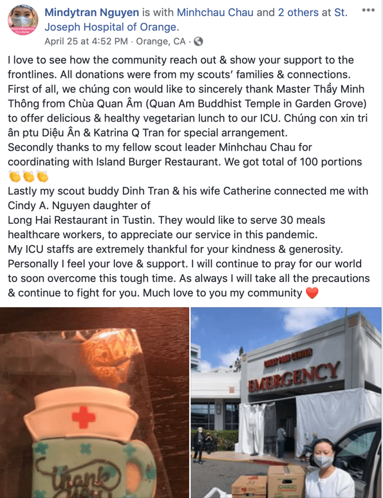 Provide food for health care workers and other workers on the frontlines. My dad at Long Hai Restaurant (25 year family owned Vietnamese local restaurant) will cook the meals with love and care for Fountain Valley Hospital, St. Joseph Hospital ICU, Kaiser Urgent Care, VITAS Hospice, Team Rubicon, Community Action Partnership of Orange County, Los Alamitos Medical Center, and other health care and frontline workers in Orange County California.
